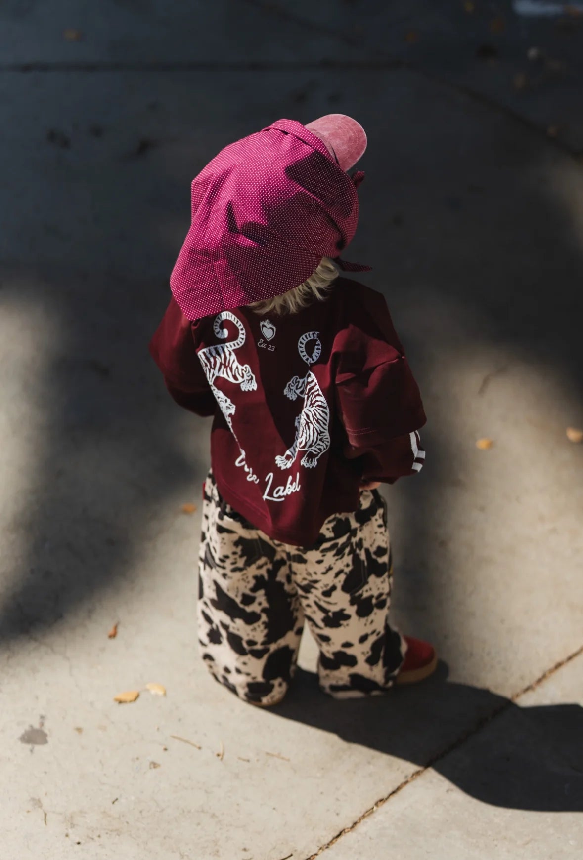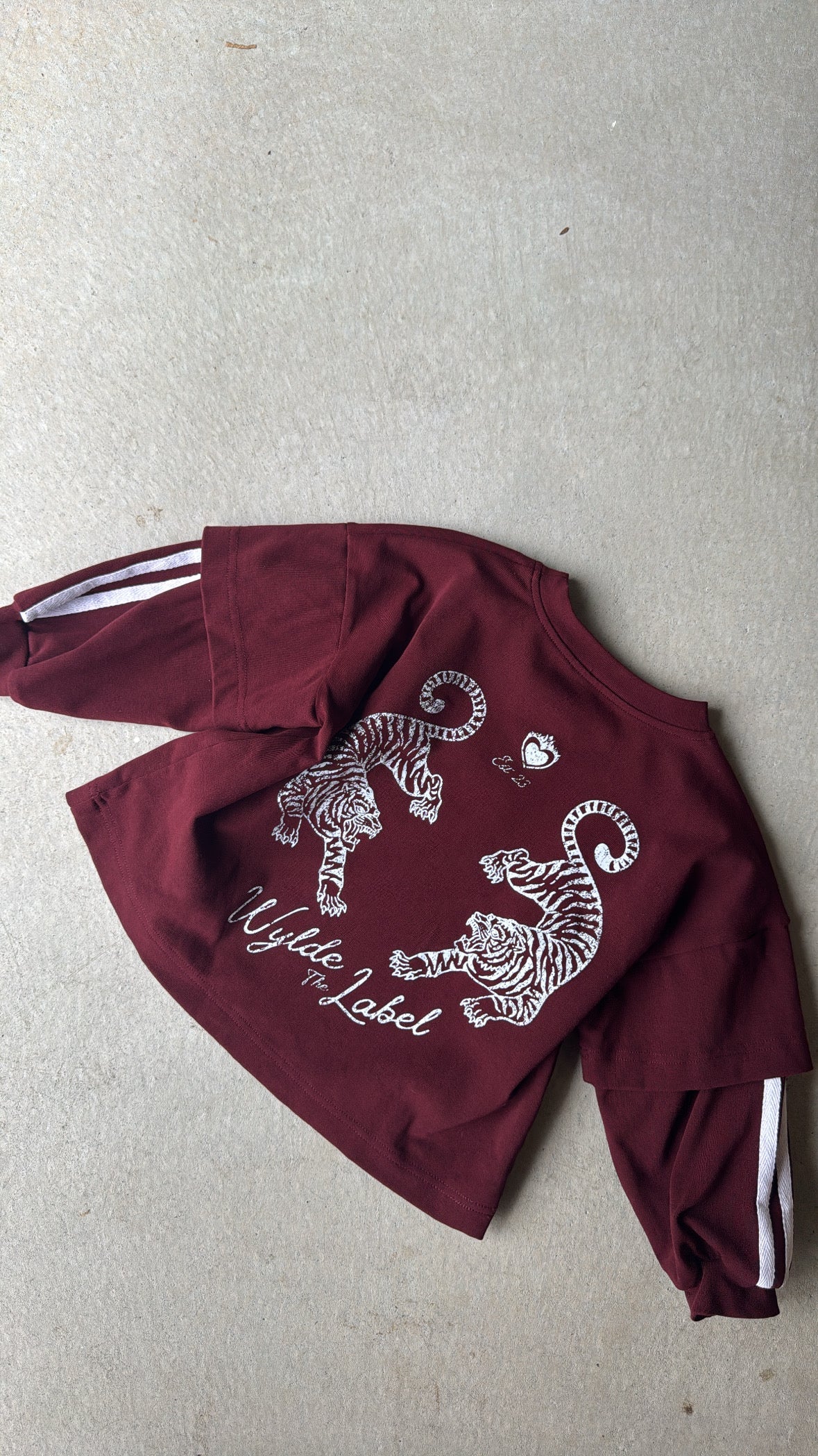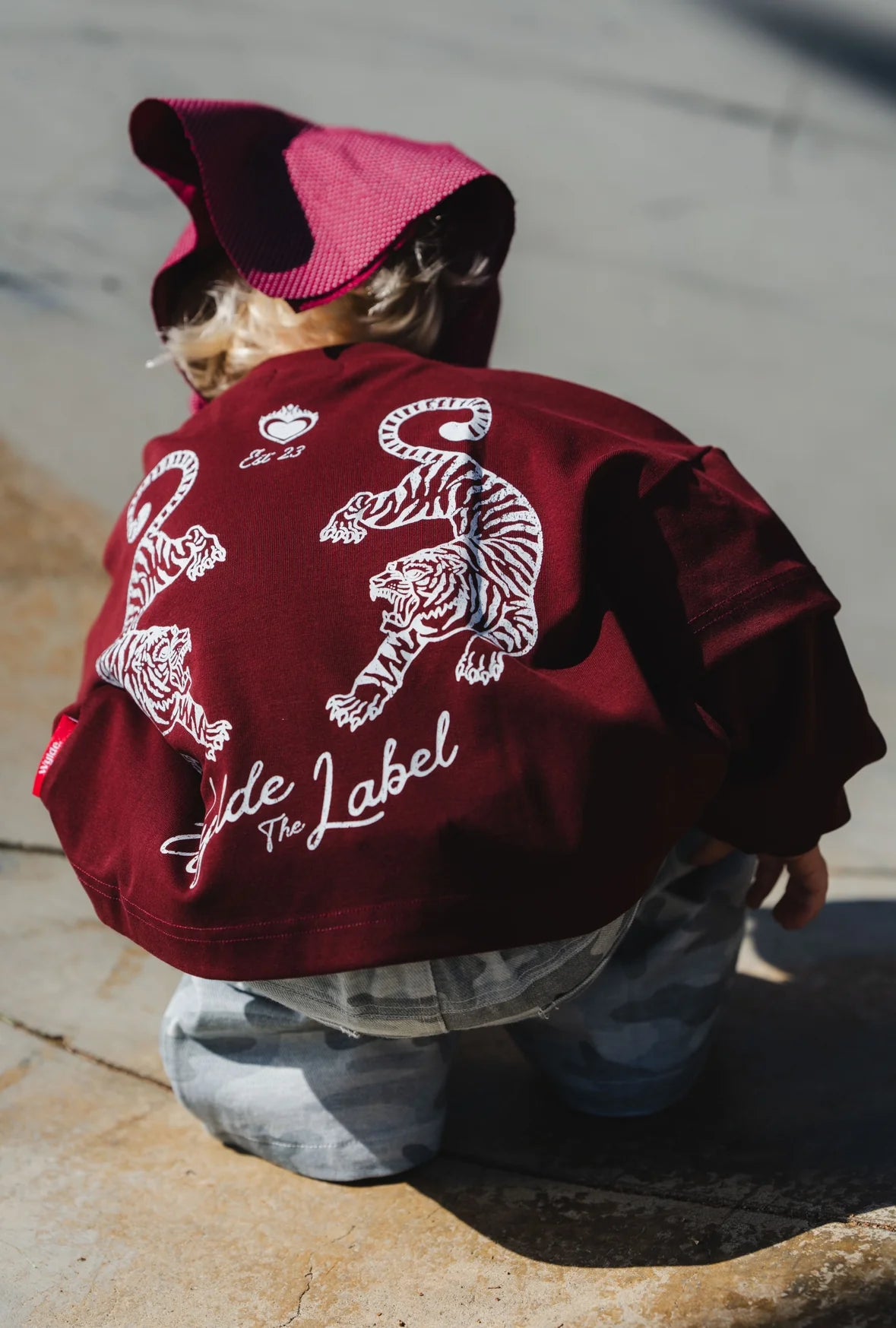Our Untamed Layer Tee comes in a rich deep maroon colour, featuring a bold tiger graphic across the back that captures the fearless Wylde spirit. Designed with an oversized fit and layered sleeve detail, it’s the perfect statement piece for building your mini’s everyday capsule wardrobe