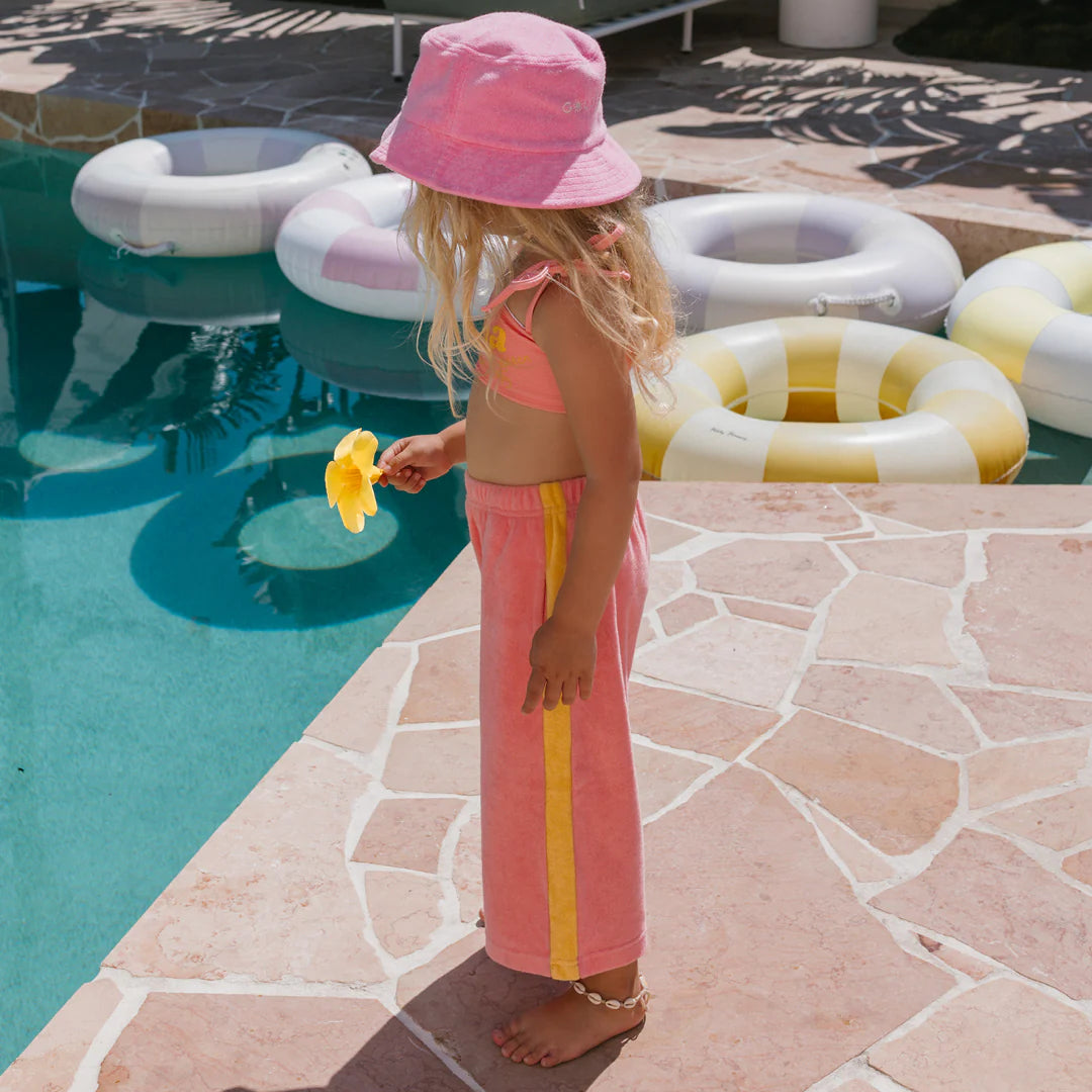 These wide leg pants are designed for an oversized fit, with an elasticated waist and two concealed side pockets. They feature a contrast golden cream (yellow)terry towel stripe to the sides. They are a versatile fit and can be worn slightly cropped as their legs grow. They are super comfortable and adorable on!