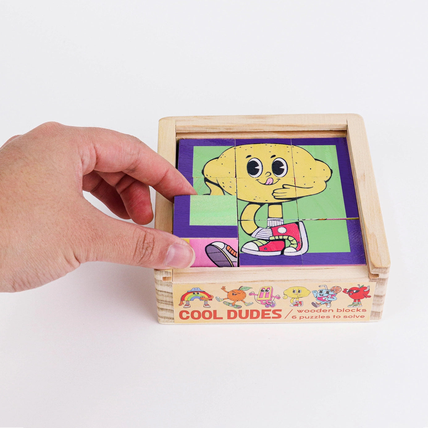 6 puzzles to solve! There's a different cool dude on each block face. That's six puzzles in one cool game. Recommended for ages 4+ Features: * Each cool dude has a different coloured border to assist kids to solve each puzzle unassisted. * Each block also fits perfectly into the tray making this game compact, neat and travel friendly. * Includes a reference pamphlet featuring all the cool dudes for kids to follow. * This product is 100% plastic free. Contains: 3 x 3 blocks (3cm x 3cm) 1 x Wooden tray to hold pieces 1 x reference pamphlet