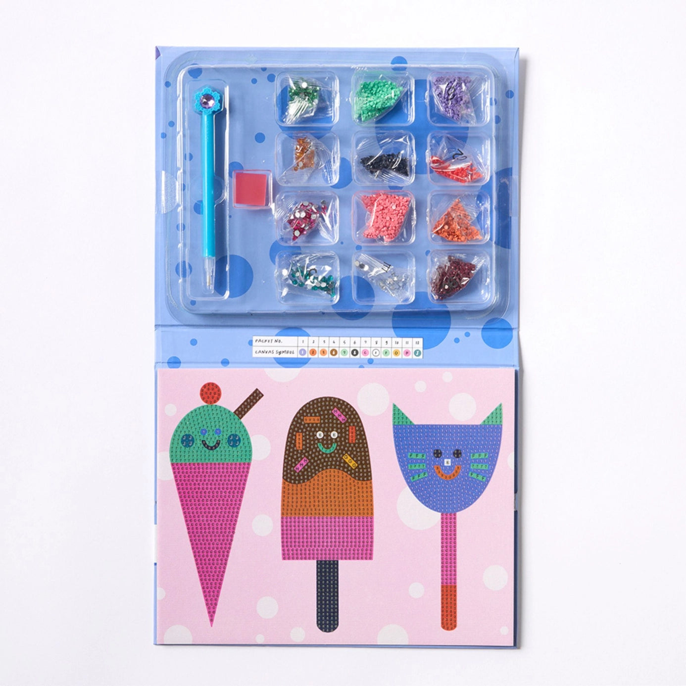 Awwww it's sooooo cuuuuute and yummy! Yum! Yum! Yum! is the funnest little kids Sparkle Art Kit. It includes everything a kidlet needs to make a sparkly ice cream creation. The canvas even has a stand so you can display it when you're done. Over 2000 wonderfully sparkly crystals for bedazzling in an easy travel case. About the Artist Bianca Palazzi is an illustrator from London. She loves using colour and shape when drawing the world around her. Her work focusses on lots of fun themes. She especially loves drawing houses, mountains and trees! How could we not turn her wonderful worlds into puzzles and paint by numbers kit for kids. Contents 1 x Self Adhesive Canvas with stand (25 x 19.5cm) 2000 x Crystals 1 x Stylus 1 x Magic Wax