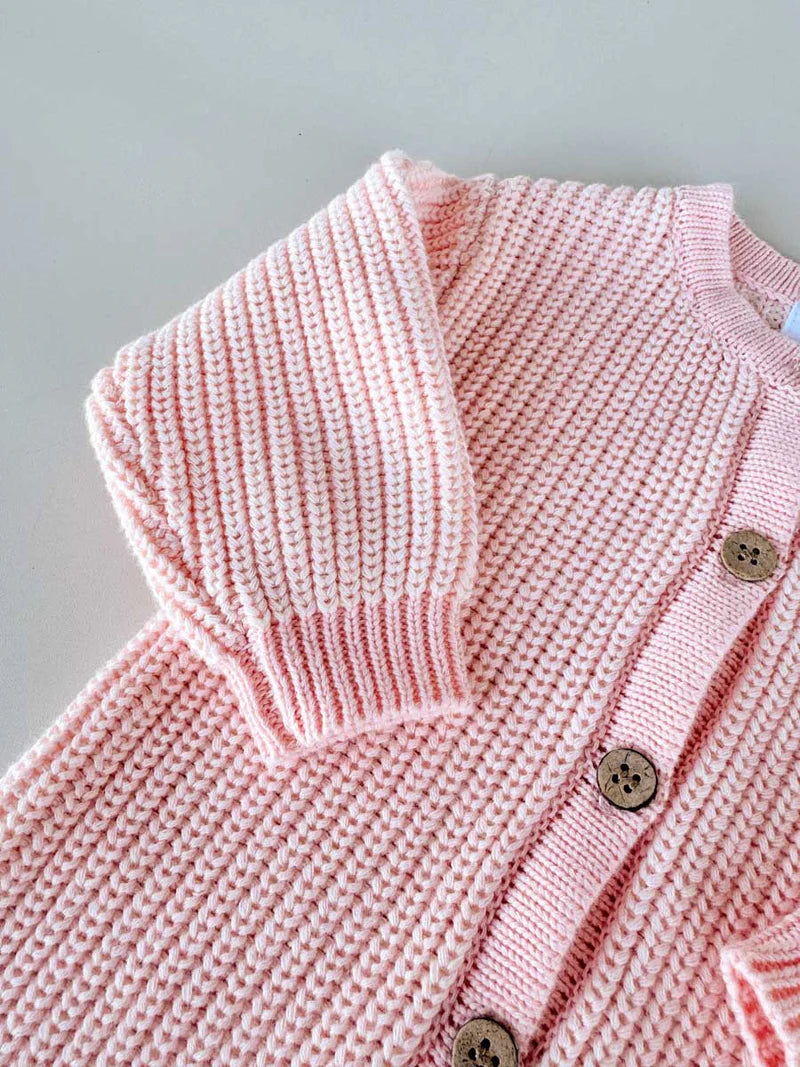 Our chunky long sleeve, full length knit romper is a classic winter staple beautifully knitted in a chunky cotton yarn with twin colours to create a varied texture. Perfect for baby's first outfit, special days, or photos, this romper is made to keep and treasure. Simple, pretty, and timeless.